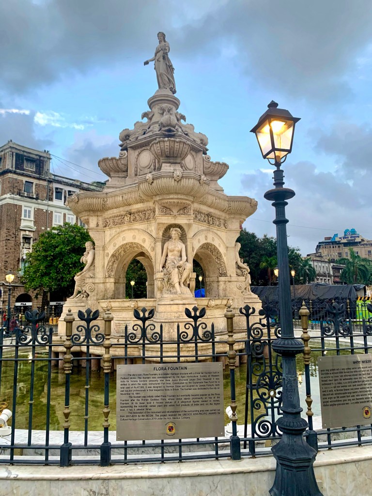 Built at a total cost of Rs. 47,000, or 9,000 pounds sterling Flora Fountain is located on historic Dada Bhai Naoroji Road on Hutatma Chowk. The fountain depicts the Roman Goddess Flora and is a famous icon of the fort business district of South Bombay.